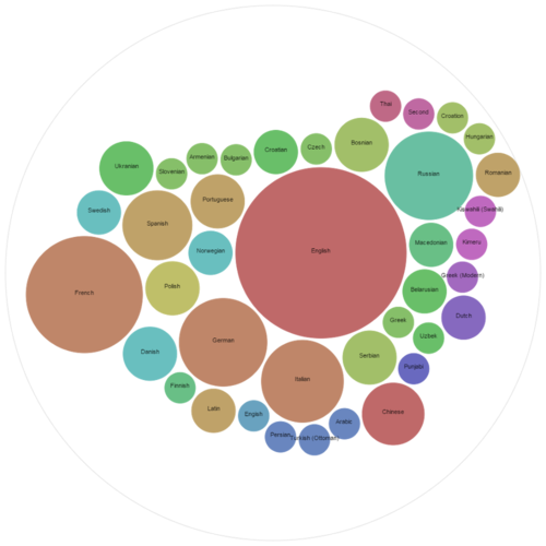 Languages in the library- below are three different visualizations using the same data representing University of Michigan Library employees who speak and/or read more than one language. also in Projects & Collaborations